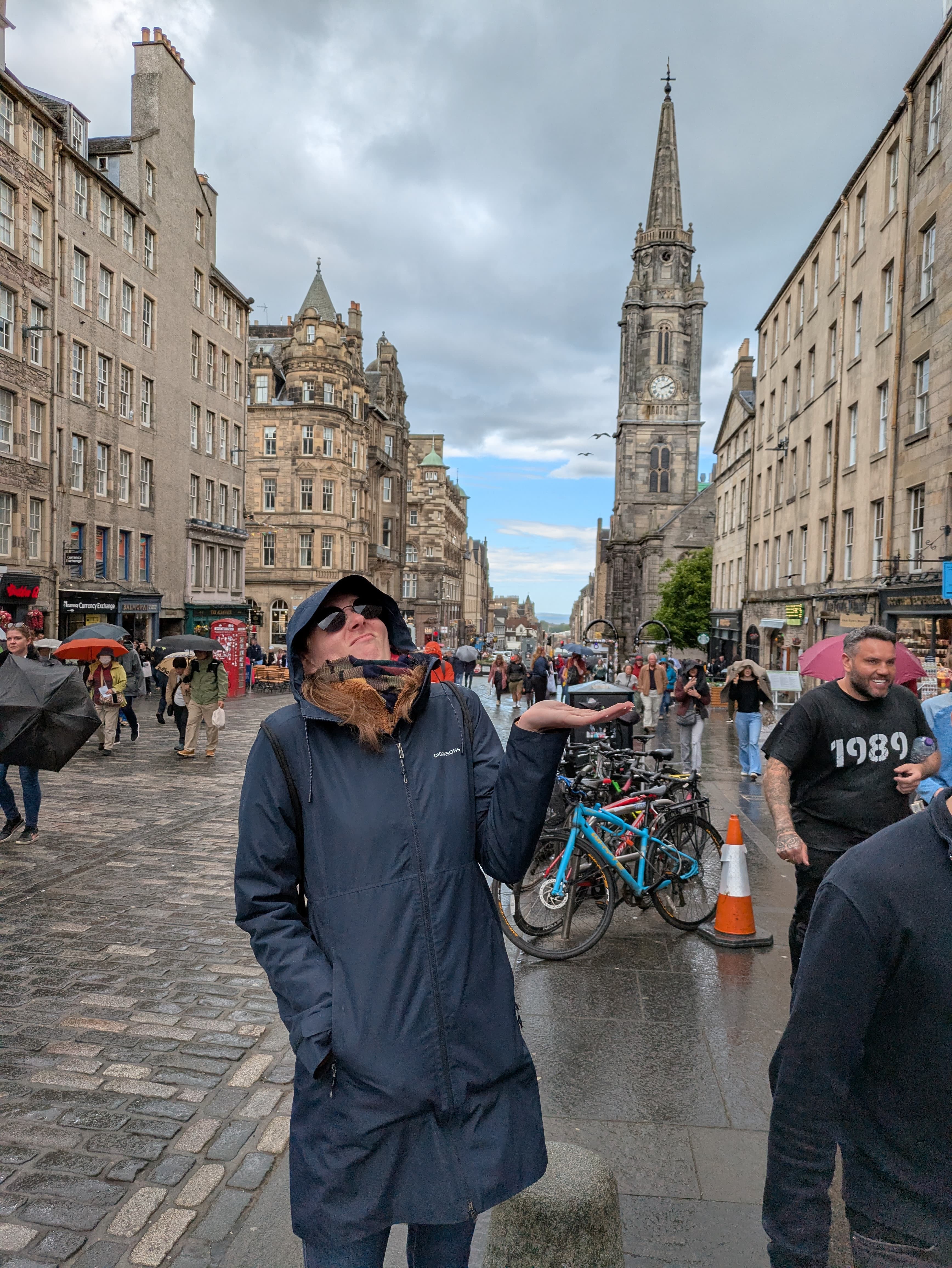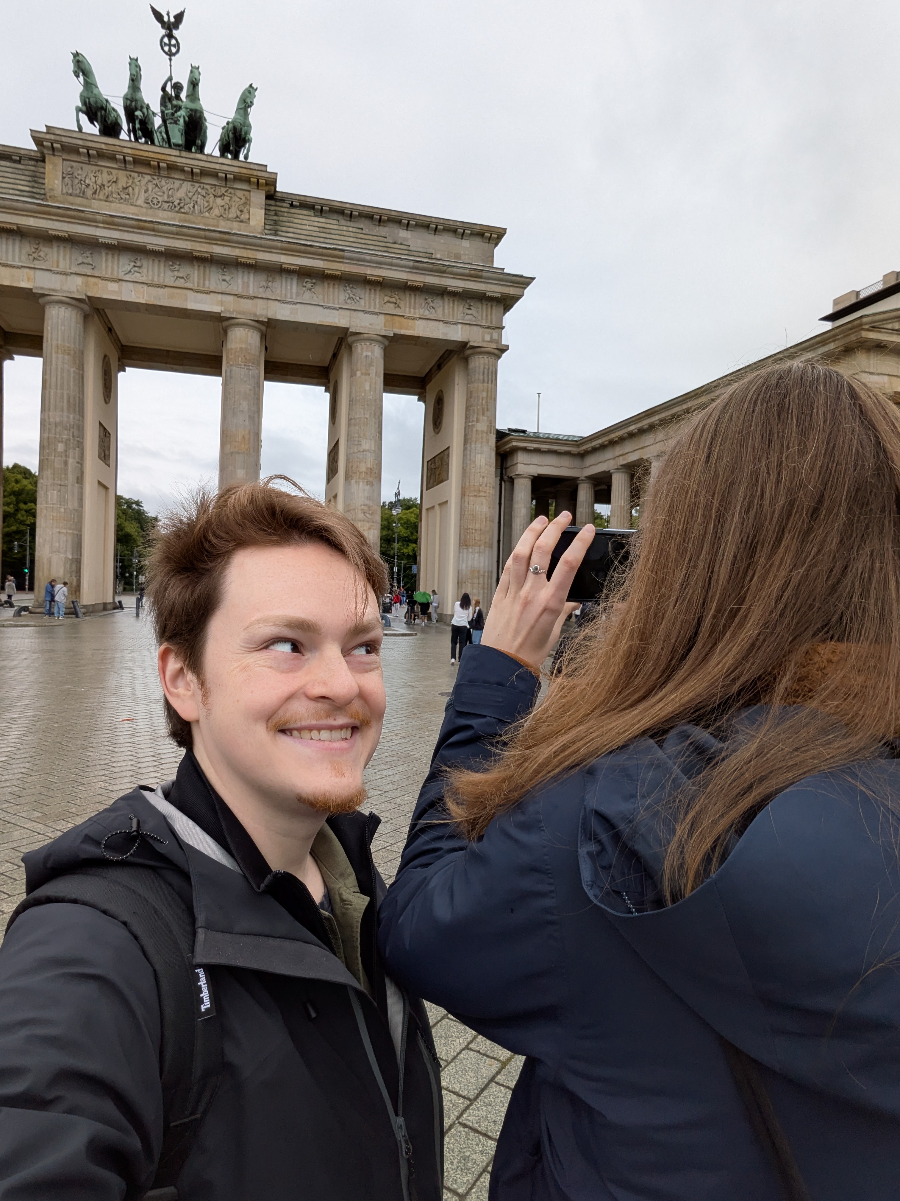 Während Annika darauf hofft, dass der Regen aufhört, sehen wir im Hintergrund einen britischen Mauerfallsympatisant