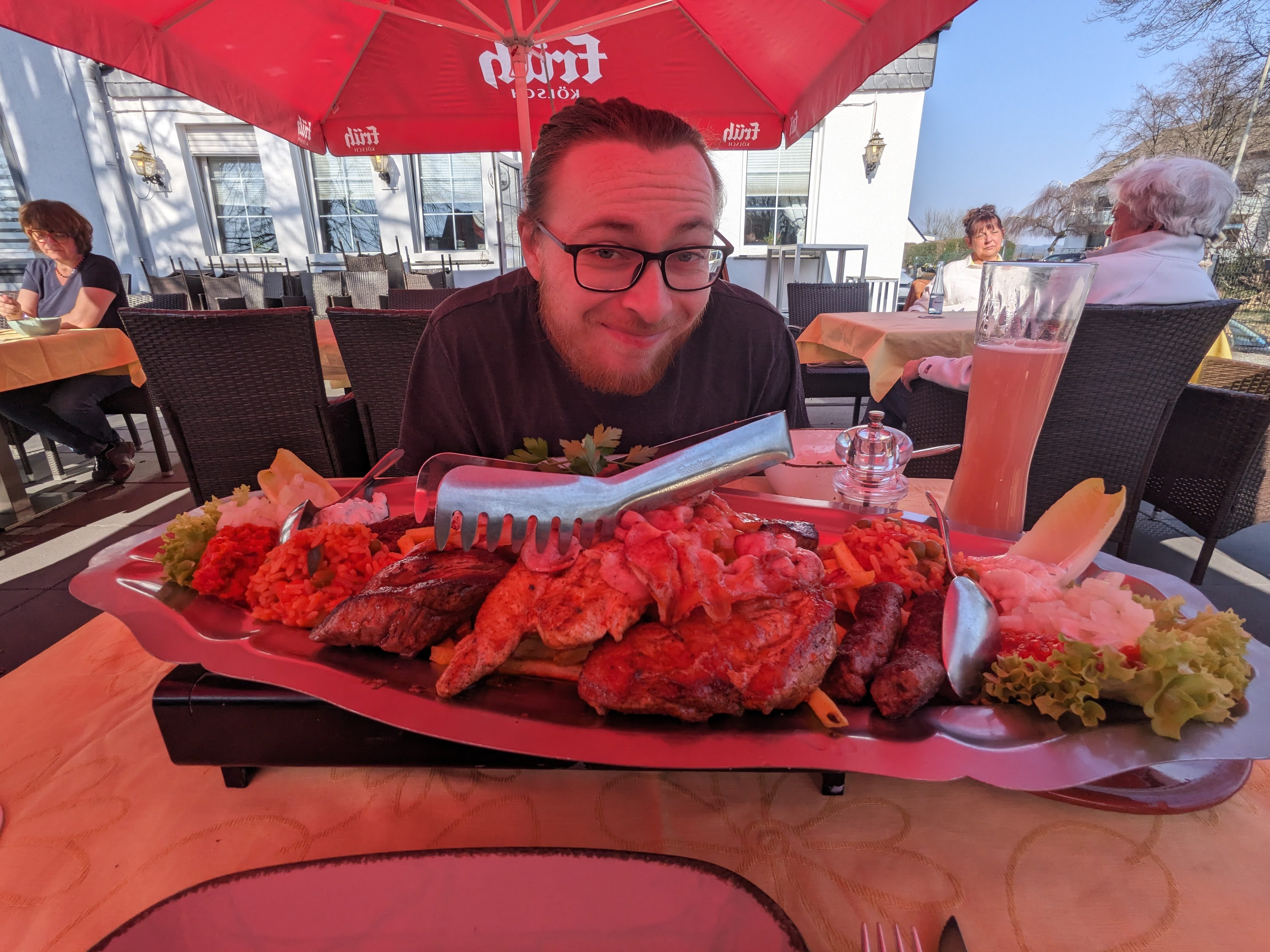 Man sieht Jojos Schmerz in den Augen, während er freundlich für das Foto lächeln muss aber eigentlich schon längst angefangen hätte zu essen